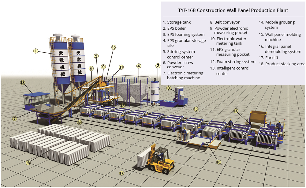 خط إنتاج ألواح الحوائط TYF-16B يملك قابلية التطبيق لإنتاج ألواح حوائط مركبة خفيفة الوزن من ألواح سيليكات الكالسيوم من الجانبين أو ألواح حوائط خفيفة الوزن GRC ومناسب للمواد التي تشمل الأسمنت، الرماد المتطاير، جزيئات البولي ستارين EPS، الرمل و ceramsite. بحيث يمكن صب (قولبة) 10 قطع في مرة واحدة.