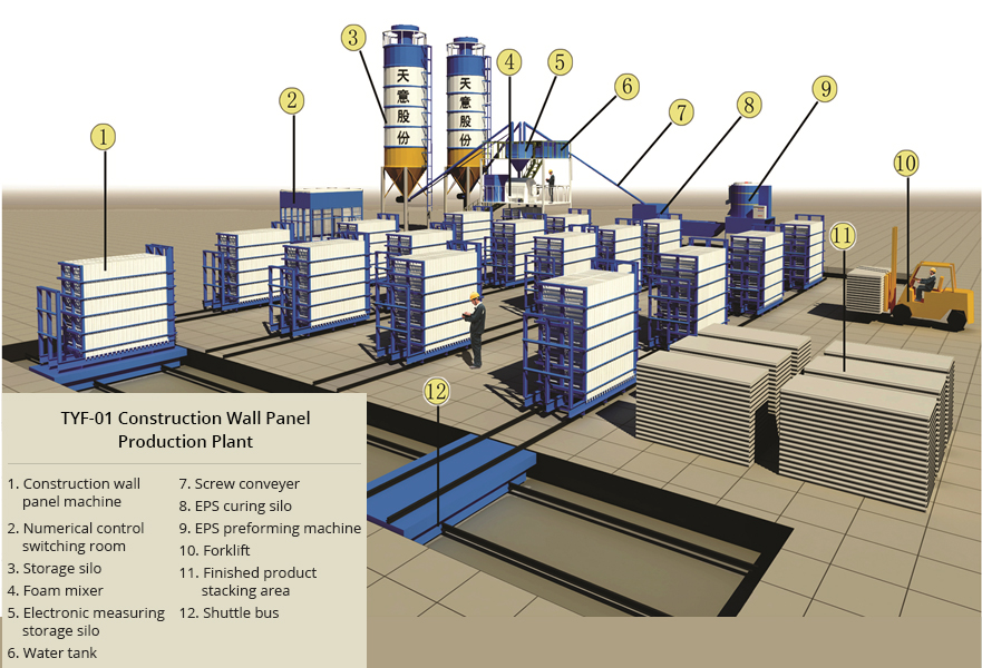 خط إنتاج ألواح الحوائط TYF-01 يملك قابلية التطبيق لإنتاج ألواح حوائط مركبة خفيفة الوزن من ألواح سيليكات الكالسيوم من الجانبين. المواد القابلة للتطبيق تشمل الأسمنت، الرماد المتطاير، جزيئات البولي ستارين EPS، الرمل و ceramsite، الخ. بحيث يمكن صب (قولبة) 40 قطع في مرة واحدة.