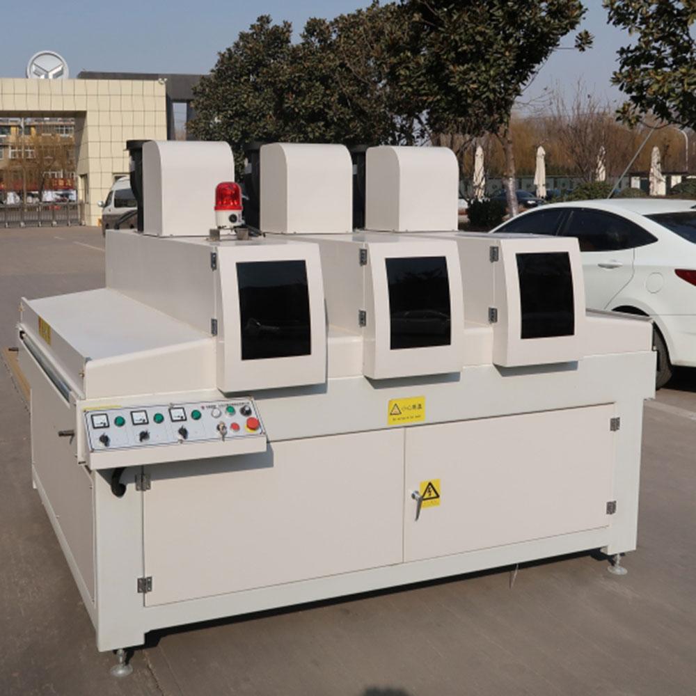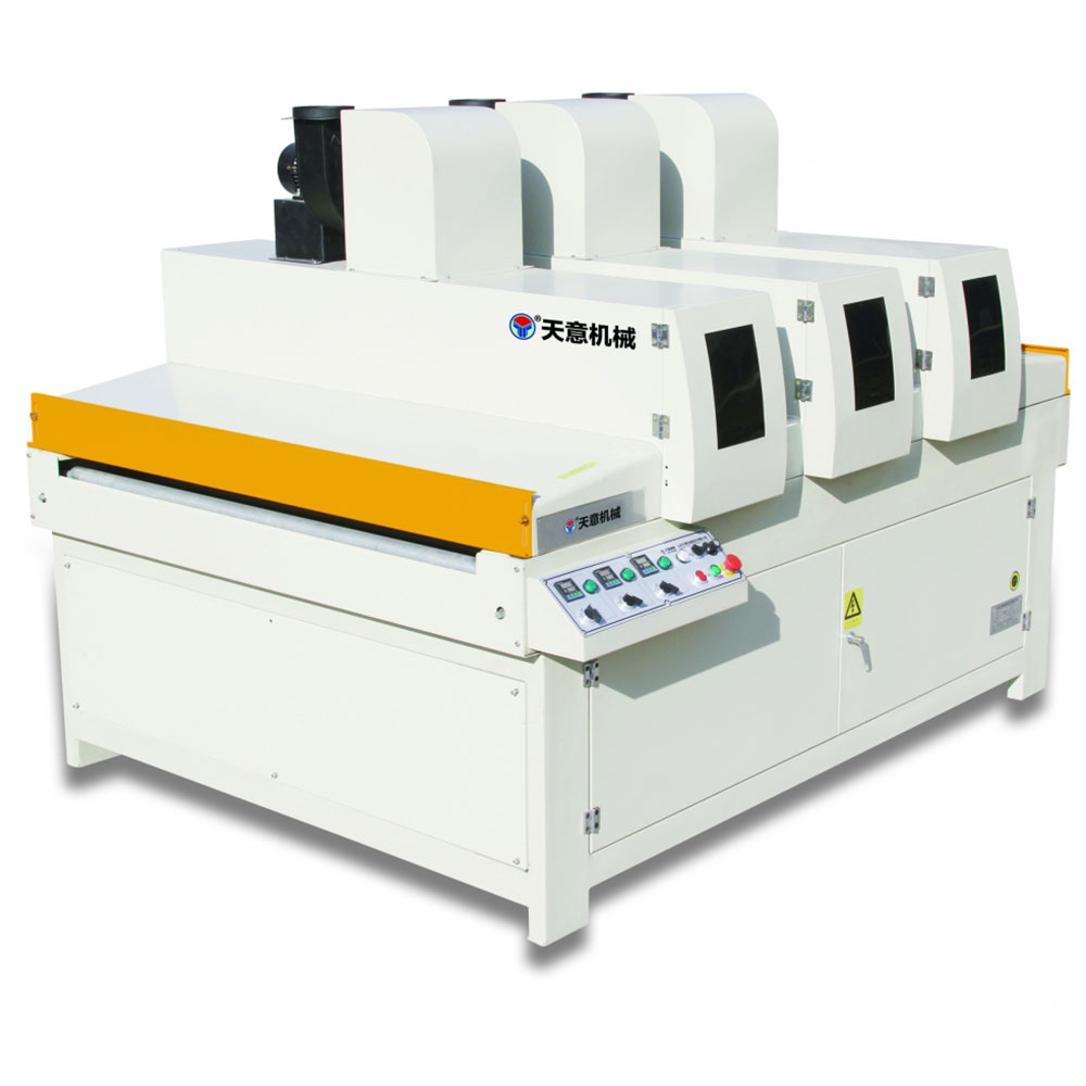 ماكينة زيادة صلابة مع ضوء UV ثلاثي جُهزت بثلاث فئات من أنابيب إضاءة UV، تستخدم للتجفيف الفوري والمعالجة للواح المطلية بطلاء UV لقطع العمل ذات الشكل الخاص، كمثال على ذلك ألواح الديكورات، الأثاث اللوحي، ألواح الخزانات، الواح الأرضيات، الأبواب اللوحية، الأشغال الفنية، الستائر، الواح سيليكات الكالسيوم وألواح أكسيد المغنسيوم.